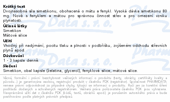 Dvojnásobná síla simetikonu, obohacená o mátu a fenykl. Vysoká dávka simetikonu 80 mg. Nově s fenyklem a mátou pro správnou činnost střev a pro omezení vzniku plynatosti.