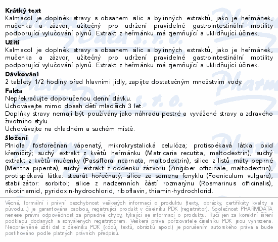 Kalmacol je doplněk stravy s obsahem silic a bylinných extraktů, jako je heřmánek, mučenka a zázvor, užitečný pro udržení pravidelné gastrointestinální motility podporující vylučování plynů. Extrakt z heřmánku má zjemňující a uklidňující účinek.