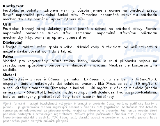 Fructolax je doplněk stravy určený k podpoře normální funkce střevního traktu a přirozeného vyprazdňování. Jedná se o přírodní produkt, který kombinuje výtažky z ovoce a vlákniny, což je klíčové pro jeho šetrné a účinné působení. Hlavním účelem Fructolax tablet je pomoc při zácpě nebo nepravidelné stolici. Fungují na principu jemné stimulace střevní funkce, aniž by dráždily střeva nebo byly návykové. Přípravek je vhodný: na občasné problémy s vyprazdňováním, pravidelnou podporu střevní pasáže, při cestování, (kdy se střevní rytmus může změnit v důsledku změny prostředí, stravy nebo časového pásma), jako zdroj vlákniny. Obsahuje reveň, fíky, tamarind a vlákninu z akácie.