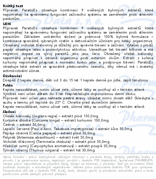Přípravek ParatizEx obsahuje kombinaci 9 ověřených bylinných extraktů pro správné fungování zažívacího systému se zaměřením proti střevním parazitům.