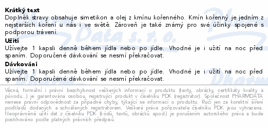 Doplněk stravy obsahuje simetikon a olej z kmínu kořenného. Kmín kořenný je jedním z nejstarších koření u nás i ve světě. Zároveň je také známý pro své účinky spojené s podporou trávení.