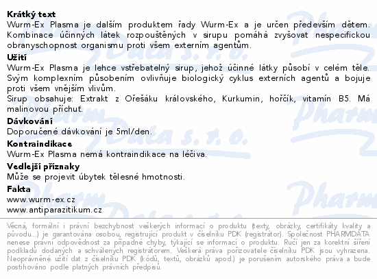 Wurm-Ex Plasma je dalším produktem řady Wurm-Ex a je určen především dětem. Kombinace účinných látek rozpouštěných v sirupu pomáhá zvyšovat nespecifickou obranyschopnost organismu proti všem externím agentům.