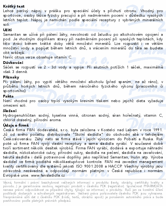 Lehce perlivý nápoj v prášku pro speciální účely s příchutí citronu. Vhodný pro sportovce, osoby těžce fyzicky pracující a při nadměrném pocení v důsledku vysokých letních teplot. Nápoj je namíchán podle speciální receptury z vybraných minerálních solí.