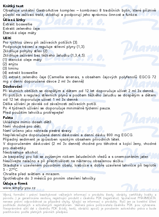 Obsahuje unikátní GastroActive komplex – kombinaci 8 tradičních bylin, které příznivě působí na zažívací trakt, zklidňují a podporují jeho správnou činnost a funkce.