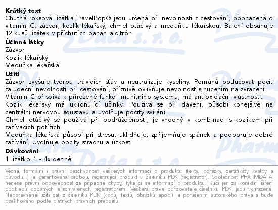 Chutná roksová lízátka TravelPop® jsou určená při nevolnosti z cestování, obohacená o vitamin C, zázvor, kozlík lékařský, chmel otáčivý a meduňku lékařskou. Balení obsahuje 12 kusů lízátek v příchutích banán a citrón.