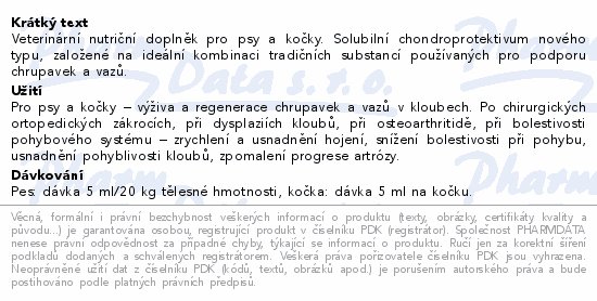 Veterinární nutriční doplněk pro psy a kočky. Solubilní chondroprotektivum nového typu, založené na ideální kombinaci tradičních substancí používaných pro podporu chrupavek a vazů.
