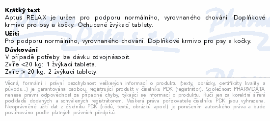 Aptus RELAX je určen pro podporu normálního, vyrovnaného chování. Doplňkové krmivo pro psy a kočky. Ochucené žvýkací tablety.