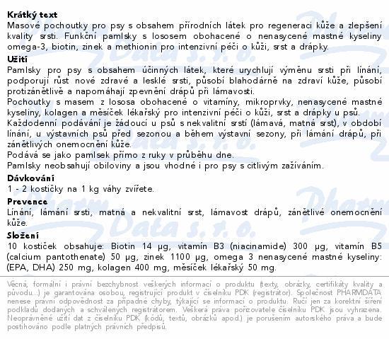 Masové pochoutky pro psy s obsahem přírodních látek pro regeneraci kůže a zlepšení kvality srsti. Funkční pamlsky s lososem obohacené o nenasycené mastné kyseliny omega-3, biotin, zinek a methionin pro intenzivní péči o kůži, srst a drápky.