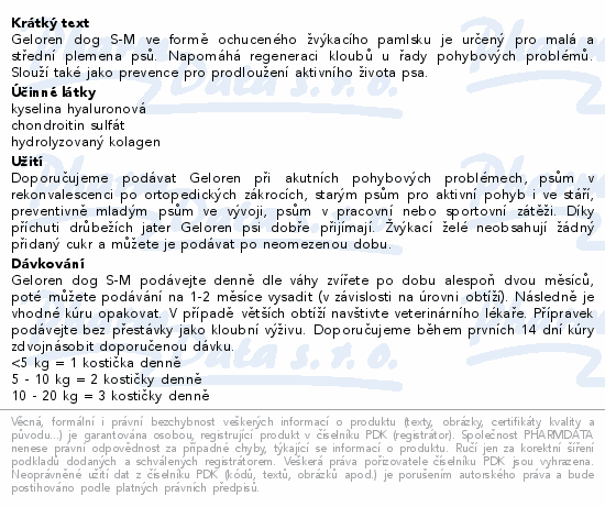 Geloren dog S-M kloubní výživa ve formě ochucených žvýkacích kostek je určená pro malá a střední plemena psů. Napomáhá regeneraci kloubů u řady pohybových problémů. Slouží také jako prevence pro prodloužení aktivního života psa.