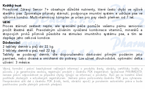 Proactivet Zdravý Senior 7+ obsahuje důležité nutrienty, které často chybí ve výživě staršího psa. Zpomaluje příznaky stárnutí, podporuje imunitní systém a udržuje psa ve výborné kondici. Multivitaminový komplex je určen pro psy všech plemen od 7 let.