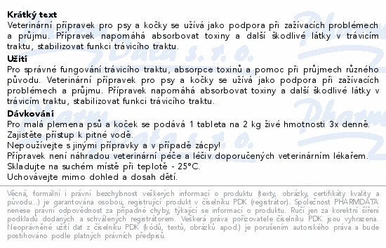 Veterinární přípravek pro psy a kočky se užívá jako podpora při zažívacích problémech a průjmu. Přípravek napomáhá absorbovat toxiny a další škodlivé látky v trávicím traktu, stabilizovat funkci trávicího traktu.
