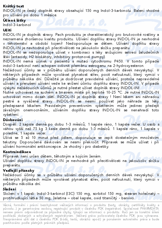 INDOL-IN je český doplněk stravy obsahující 150 mg Indol-3-karbinolu. Balení vhodné pro užívání po dobu 1 měsíce.