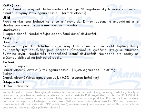 Vitex Drmek obecný od Herba medica obsahuje 60 vegetariánských kapslí s obsahem extraktu z byliny Vitex agnus-castus L. (drmek obecný).