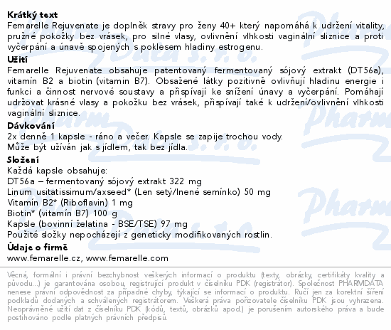 Femarelle Rejuvenate je doplněk stravy pro ženy 40+ který napomáhá k udržení vitality, pružné pokožky bez vrásek, pro silné vlasy, ovlivnění vlhkosti vaginální sliznice a proti vyčerpání a únavě spojených s poklesem hladiny estrogenu.