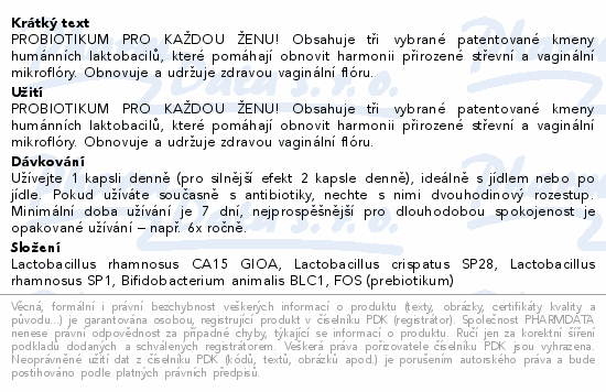 PROBIOTIKUM PRO KAŽDOU ŽENU! Obsahuje tři vybrané patentované kmeny humánních laktobacilů, které pomáhají obnovit harmonii přirozené střevní a vaginální mikroflóry. Obnovuje a udržuje zdravou vaginální flóru.