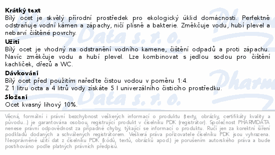 Bílý ocet je skvělý přírodní prostředek pro ekologický úklid domácnosti. Perfektně odstraňuje vodní kámen a zápachy, ničí plísně a bakterie. Změkčuje vodu, hubí plevel a nebarví čištěné povrchy.