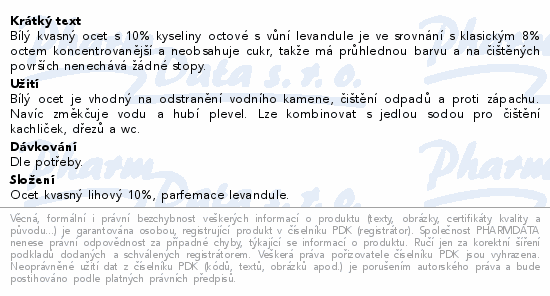 Bílý kvasný ocet s 10% kyseliny octové s vůní levandule je ve srovnání s klasickým 8% octem koncentrovanější a neobsahuje cukr, takže má průhlednou barvu a na čištěných površích nenechává žádné stopy.