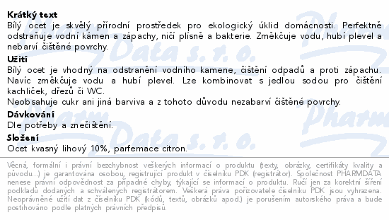 Bílý ocet je skvělý přírodní prostředek pro ekologický úklid domácnosti. Perfektně odstraňuje vodní kámen a zápachy, ničí plísně a bakterie. Změkčuje vodu, hubí plevel a nebarví čištěné povrchy.