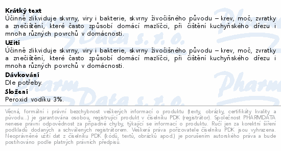 Účinně zlikviduje skvrny, viry i bakterie, skvrny živočišného původu – krev, moč, zvratky a znečištění, které často způsobí domácí mazlíčci, při čištění kuchyňského dřezu i mnoha různých povrchů v domácnosti.