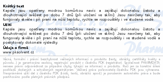 Kapsle jsou opatřeny modrou komůrkou navíc a zajišťují dokonalou čistotu a dlouhotrvající svěžest po dobu 7 dnů (při uložení ve skříni). Jsou navrženy tak, aby fungovaly skvěle i při praní na nižší teplotu, rychle se rozpouštěly i ve studené vodě.