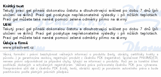 Tekutý prací gel přináší dokonalou čistotu a dlouhotrvající svěžest po dobu 7 dnů (při uložení ve skříni). Prací gel poskytuje nepřekonatelné výsledky i při nižších teplotách. Prací gel můžete také nanést pomocí zelené odměrky přímo na skvrny.
