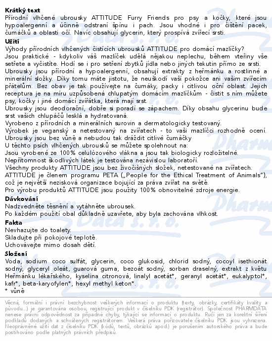Přírodní vlhčené ubrousky ATTITUDE Furry Friends pro psy a kočky, které jsou hypoalergenní a účinně odstraní špínu i pach. Jsou vhodné i pro čištění pacek, čumáčků a oblasti očí. Navíc obsahují glycerin, který prospívá zvířecí srsti.