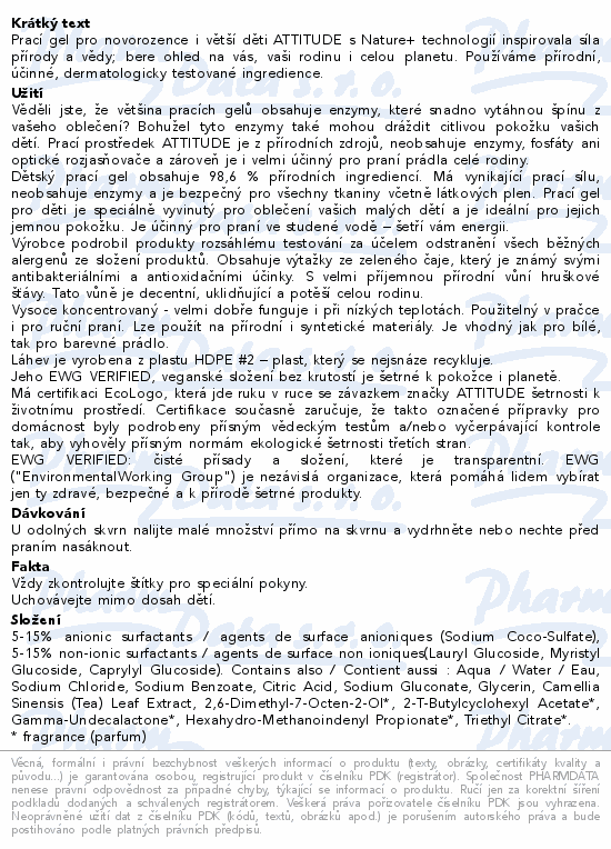 Prací gel pro novorozence i větší děti ATTITUDE s Nature+ technologií inspirovala síla přírody a vědy; bere ohled na vás, vaši rodinu i celou planetu. Používáme přírodní, účinné, dermatologicky testované ingredience.