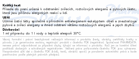 Přísada do praní určená k odstranění zvířecích, roztočových alergenů a pylových částic, které jsou příčinou alergických reakcí u lidí.