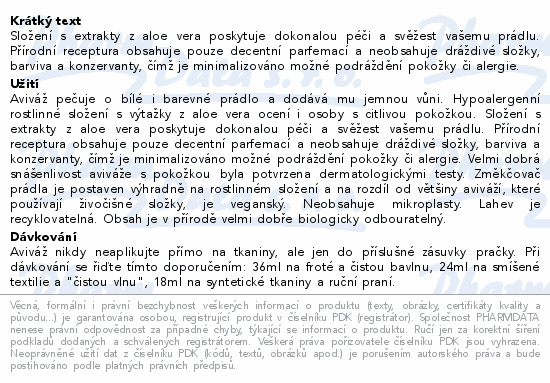 Složení s extrakty z aloe vera poskytuje dokonalou péči a svěžest vašemu prádlu. Přírodní receptura obsahuje pouze decentní parfemací a neobsahuje dráždivé složky, barviva a konzervanty, čímž je minimalizováno možné podráždění pokožky či alergie.