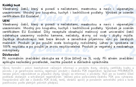 Všestranný čistič, který si poradí s nečistotami, mastnotou a navíc i vápenatými usazeninami. Vhodný pro koupelnu, kuchyň i kachličkové podlahy. Výrobek je oceněn certifikátem EU Ecolabel.