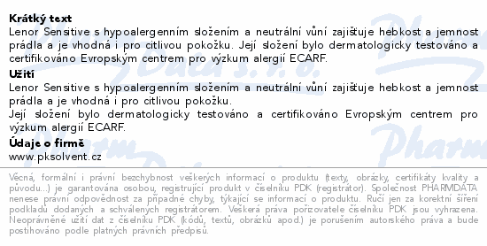Lenor Sensitive s hypoalergenním složením a neutrální vůní zajišťuje hebkost a jemnost prádla a je vhodná i pro citlivou pokožku. Její složení bylo dermatologicky testováno a certifikováno Evropským centrem pro výzkum alergií ECARF.