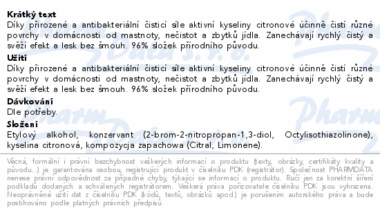 Díky přirozené a antibakteriální čisticí síle aktivní kyseliny citronové účinně čistí různé povrchy v domácnosti od mastnoty, nečistot a zbytků jídla. Zanechávají rychlý čistý a svěží efekt a lesk bez šmouh. 96% složek přírodního původu.
