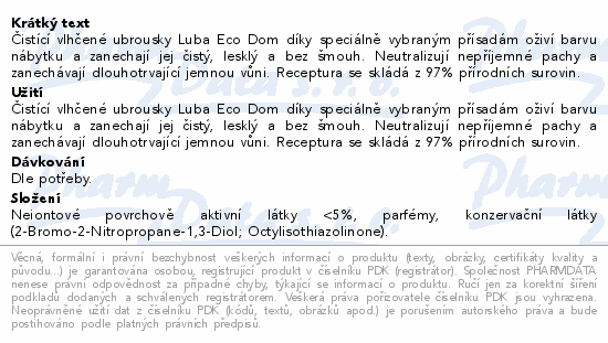 Čistící vlhčené ubrousky Luba Eco Dom díky speciálně vybraným přísadám oživí barvu nábytku a zanechají jej čistý, lesklý a bez šmouh. Neutralizují nepříjemné pachy a zanechávají dlouhotrvající jemnou vůni. Receptura se skládá z 97% přírodních surovin.