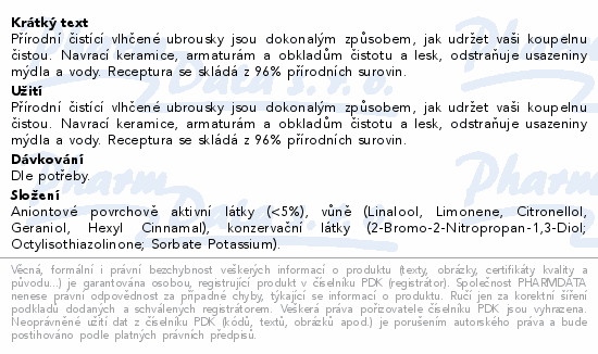 Přírodní čistící vlhčené ubrousky jsou dokonalým způsobem, jak udržet vaši koupelnu čistou. Navrací keramice, armaturám a obkladům čistotu a lesk, odstraňuje usazeniny mýdla a vody. Receptura se skládá z 96% přírodních surovin.