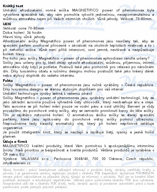 Unikátní afrodiziakální vonná svíčka MAGNETIFICO power of pheromones byla vytvořena speciálně tak, aby vám pomohla vytvořit jedinečnou, nezapomenutelnou a svůdnou atmosféru nejen při Vašich intimních chvílích. Vůně jahody. Velikost: 70-80mm.