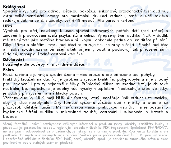 Speciálně vyvinutý pro citlivou dětskou pokožku, silikonový, ortodontický tvar dudlíku, extra velké ventilační otvory pro maximální cirkulaci vzduchu, tenčí a užší savička redukuje tlak na čelist a zoubky, věk 6-18 měsíců. Mix barev v kartonu.