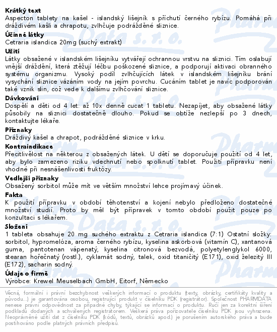 Aspecton tablety na kašel - islandský lišejník s příchutí černého rybízu účinně bojují proti dráždivému kašli a chrapotu a zvlhčují podrážděné sliznice. Napomáhají vytvářet ochrannou vrstvu na sliznici, a tím oslabují vnější dráždění a podporují aktivaci obranného systému organismu. Cucání těchto tablet podporuje také vznik slin, což vede k dalšímu zvlhčování sliznice.