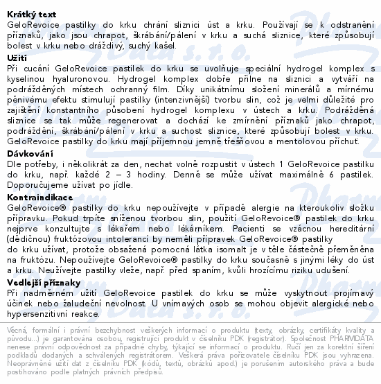 GeloRevoice pastilky do krku chrání sliznici úst a krku. Používají se k odstranění příznaků, jako jsou chrapot, škrábání/pálení v krku a suchá sliznice, které způsobují bolest v krku nebo dráždivý, suchý kašel.