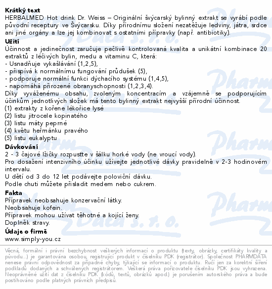 HERBALMED Hot drink Dr. Weiss – Originální švýcarský bylinný extrakt se vyrábí podle původní receptury ve Švýcarsku. Díky přírodnímu složení nezatěžuje ledviny, játra, srdce ani jiné orgány a lze jej kombinovat s ostatními přípravky (např. antibiotiky).