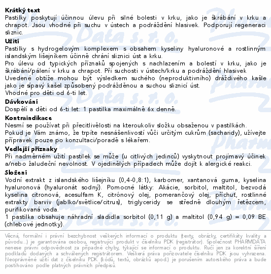 Pastilky poskytují účinnou úlevu při silné bolesti v krku, jako je škrábání v krku a chrapot. Jsou vhodné při suchu v ústech a podráždění hlasivek. Podporují regeneraci sliznic.