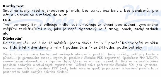Sirup na suchý kašel s jahodovou příchutí, bez curku, bez barviv, bez parabenů, pro děti a kojence od 6 měsíců do 6 let.