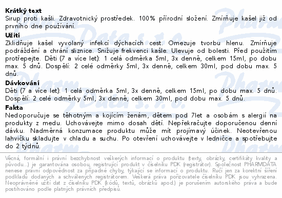 Sirup proti kašli. Zdravotnický prostředek. 100% přírodní složení. Zmírňuje kašel již od prvního dne používání.