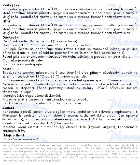 Zdravotnický prostředek NEKAŠLI® Junior sirup obsahuje směs 5 rostlinných extraktů, které pomáhají zmírnit příznaky spojené s onemocněními z nachlazení, jako je suchý a vlhký kašel, podráždění hlasivek, bolest v krku a chrapot. Pomáhá odstraňovat hlen.