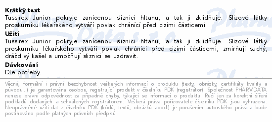 Tussirex Junior pokryje zanícenou sliznici hltanu, a tak ji zklidňuje. Slizové látky proskurníku lékařského vytváří povlak chránící před cizími částicemi.