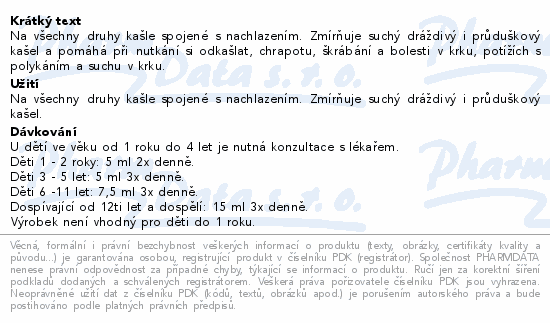 Na všechny druhy kašle spojené s nachlazením. Zmírňuje suchý dráždivý i průduškový kašel a pomáhá při nutkání si odkašlat, chrapotu, škrábání a bolesti v krku, potížích s polykáním a suchu v krku.