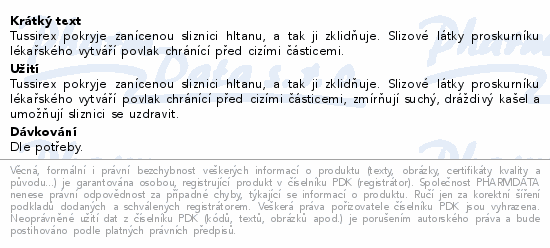 Tussirex pokryje zanícenou sliznici hltanu, a tak ji zklidňuje. Slizové látky proskurníku lékařského vytváří povlak chránící před cizími částicemi.