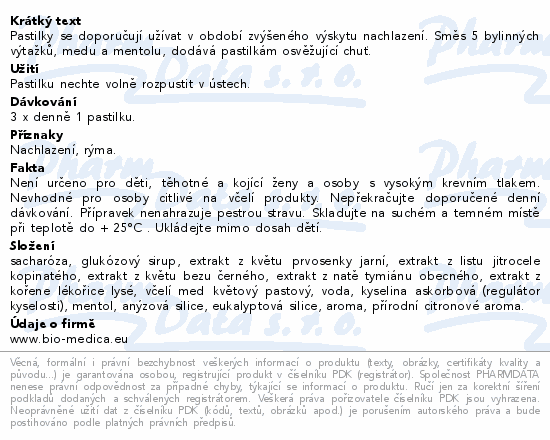 Pastilky se doporučují užívat v období zvýšeného výskytu nachlazení. Směs 5 bylinných výtažků, medu a mentolu, dodává pastilkám osvěžující chuť.