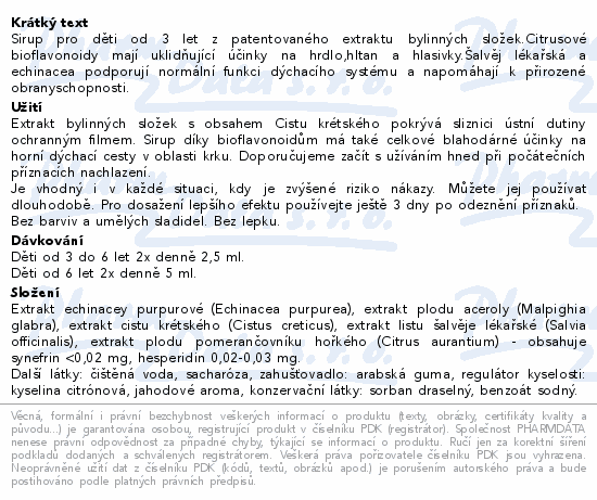 Sirup pro děti od 3 let z patentovaného extraktu bylinných složek.Citrusové bioflavonoidy mají uklidňující účinky na hrdlo,hltan a hlasivky.Šalvěj lékařská a echinacea podporují normální funkci dýchacího systému a napomáhají k přirozené obranyschopnosti.