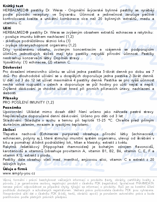 HERBALMED® pastilky Dr. Weiss - Originální švýcarské bylinné pastilky se vyrábějí podle původní receptury ve Švýcarsku. Účinnost a jedinečnost zaručuje pečlivě kontrolovaná kvalita a unikátní kombinace více než 20 bylinných extraktů, medu a vitaminu C.