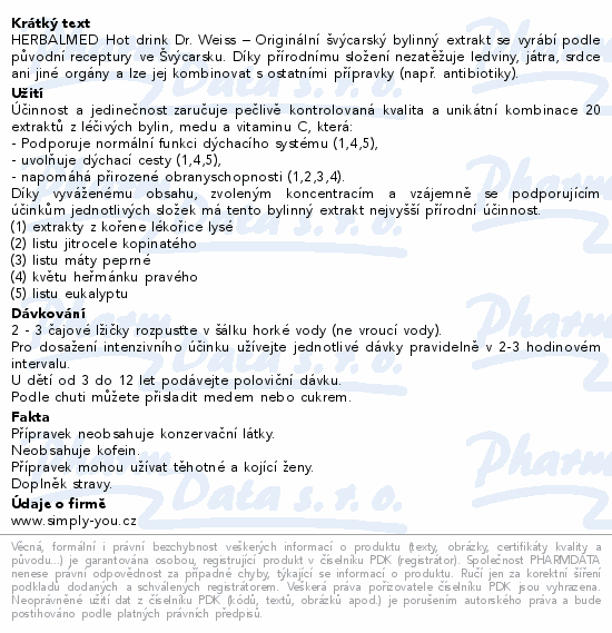 HERBALMED Hot drink Dr. Weiss – Originální švýcarský bylinný extrakt se vyrábí podle původní receptury ve Švýcarsku. Díky přírodnímu složení nezatěžuje ledviny, játra, srdce ani jiné orgány a lze jej kombinovat s ostatními přípravky (např. antibiotiky).